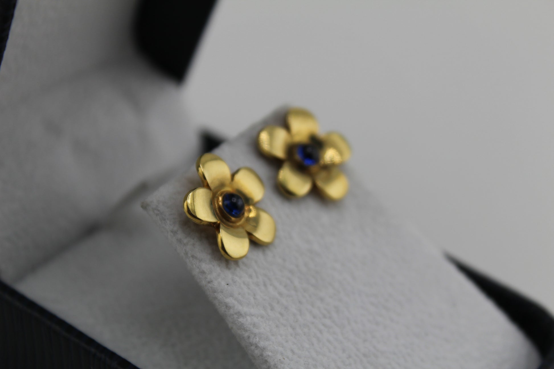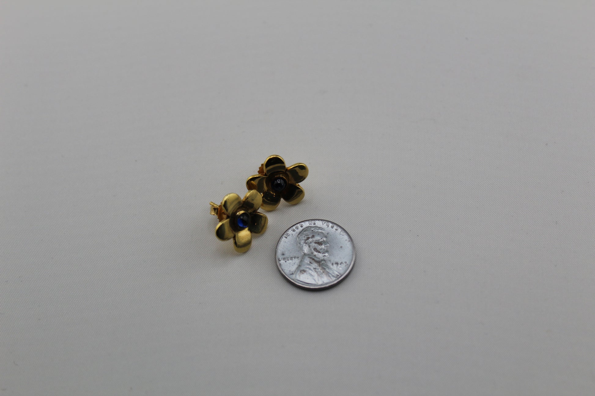 These playful yet elegant earrings are crafted in 18k yellow gold, each designed as a stylized five-petal flower with a rich blue sapphire cabochon at the center. Their sculptural petals catch the light with a warm glow, while the sapphires add a striking pop of color. A timeless estate pair with vintage charm.